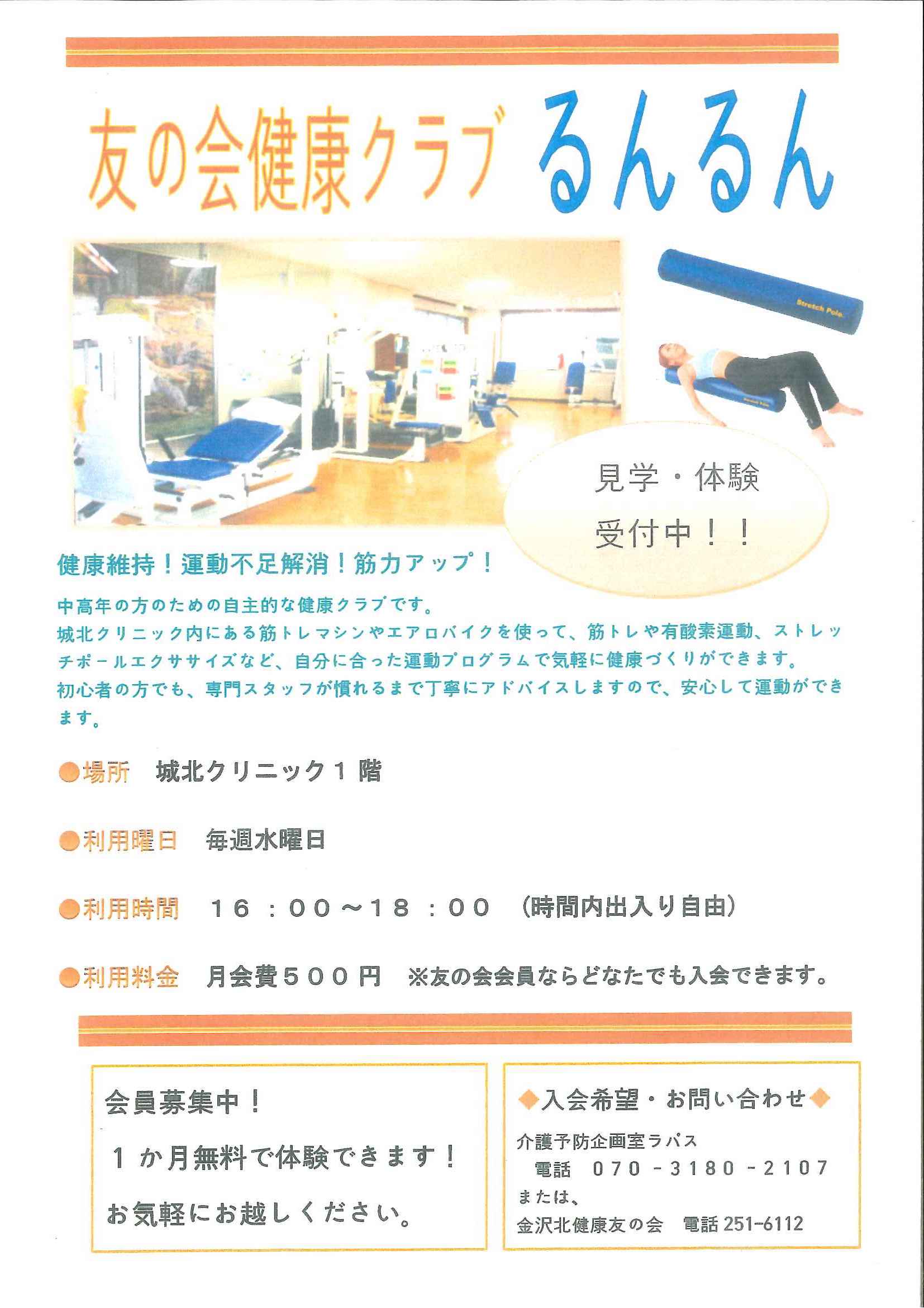[健康クラブるんるん]は、運動不足を解消したい、筋力をつけたい、健康を維持したいなど、中高年の方のための自主的な運動クラブです。